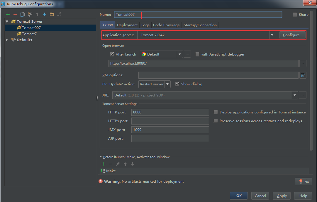 3.2 在"Name"处输入新的服务名,点击“Application server”后面的“Configure...”,弹出Tomcat Server窗口,选择本地安装的Tomcat目录 -> OK
