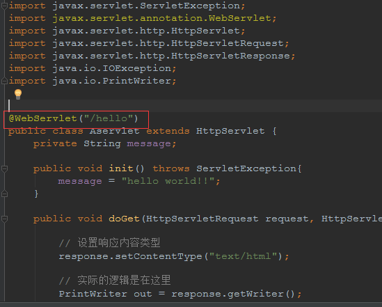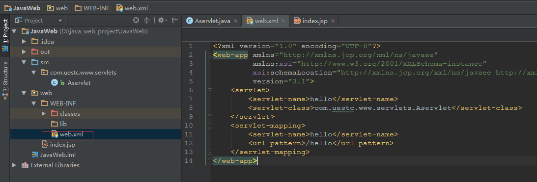 在web.xml中配置Servlet的目的其实只有一个,就是把访问路径与一个Servlet绑定到一起,上面配置是把访问路径:“/hello”与“com.uestc.www.servlets.Aservlet”绑定到一起。