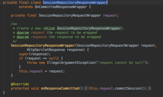 响应重写的目的是确保在请求提交时能够把session保存起来。来看下 SessionRepositoryResponseWrapper 类的实现: