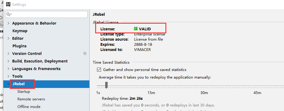启动idea,在file-》settings-》JRebel 查看激活状态