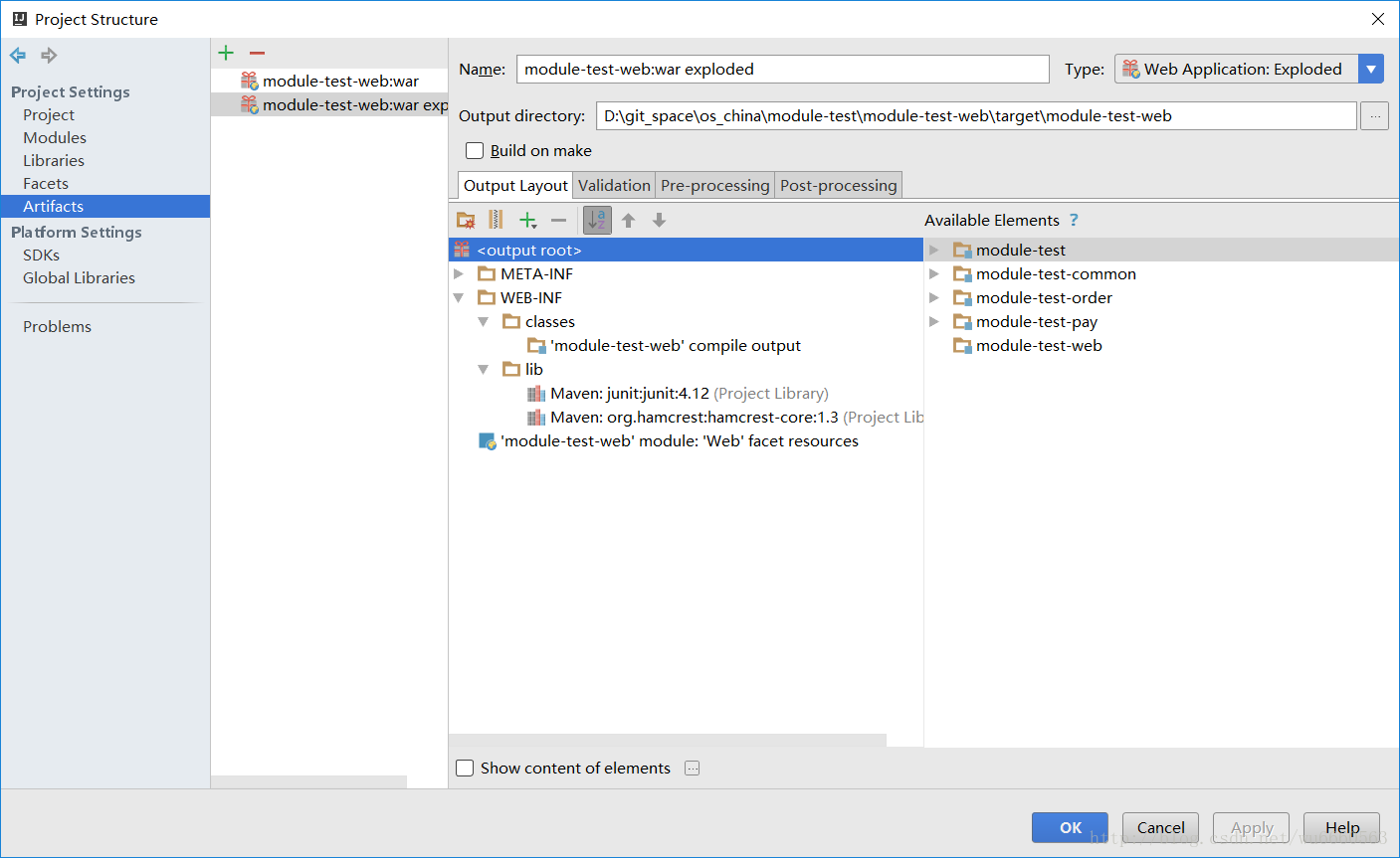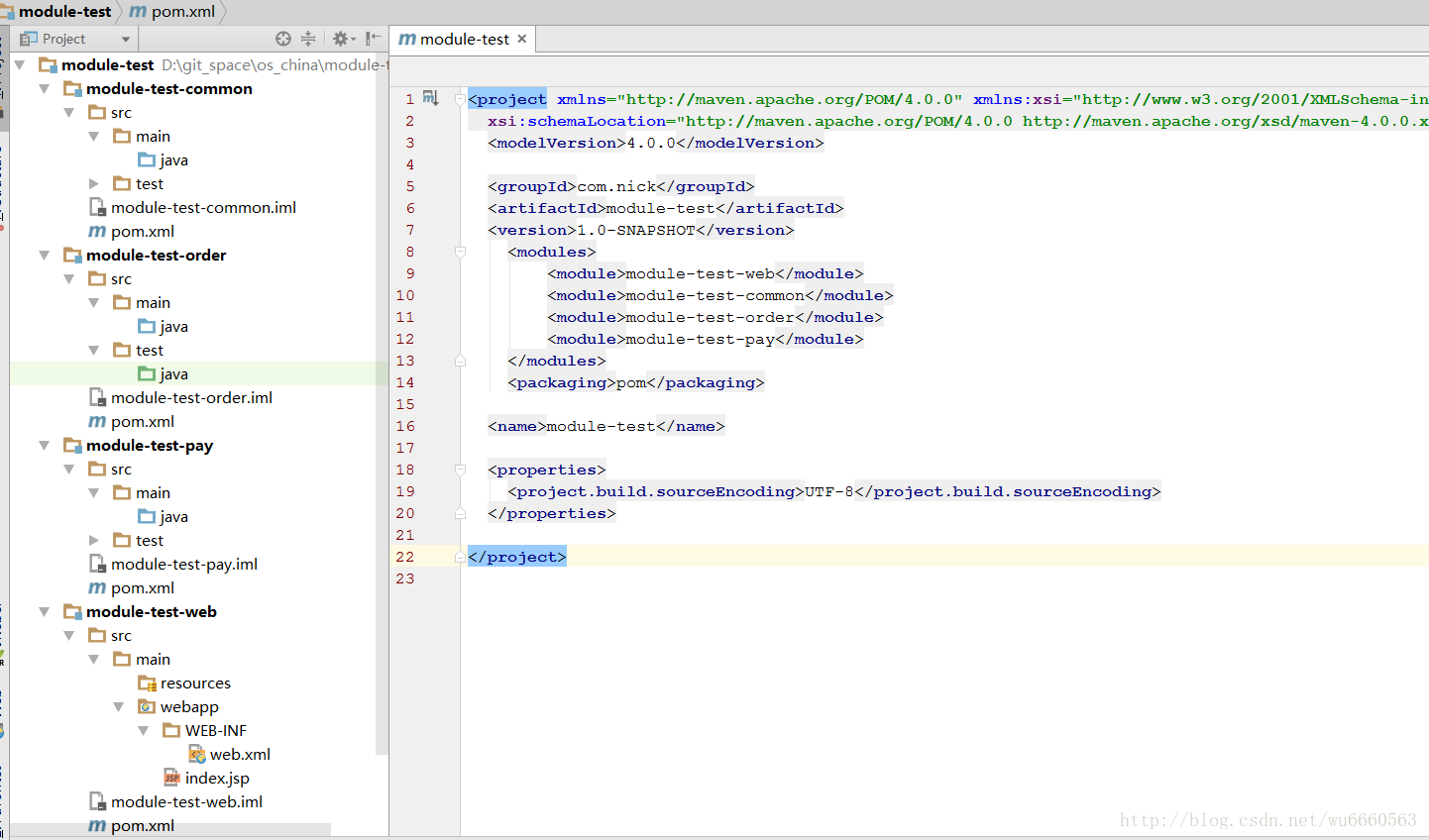 <modules> <module>module-test-web</module> <module>module-test-common</module> <module>module-test-order</module> <module>module-test-pay</module> </modules>