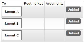 Fanout Exchange形式又叫广播形式,因此我们发送到路由器的消息会使得绑定到该路由器的每一个Queue接收到消息。首先需要在RabbitMQ服务端创建交换机fanoutExchange,并绑定三个queue:fanout.A、fanout.B、fanout.C。