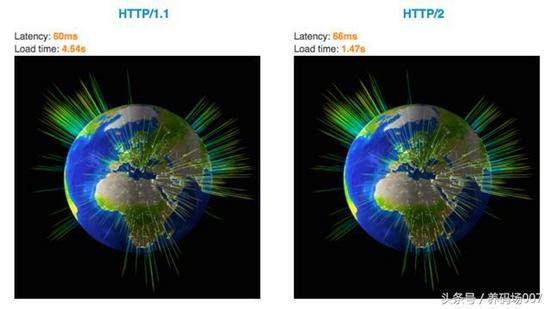 下图是Akamai 公司建立的一个官方的演示,主要用来说明在性能上HTTP/1.1和HTTP/2在性能升的差别。同时请求 379 张图片,HTTP/1.1加载用时4.54s,HTTP/2加载用时1.47s,大家可以通过 https://http2.akamai.com/demo 来感受下HTTP2的提速。