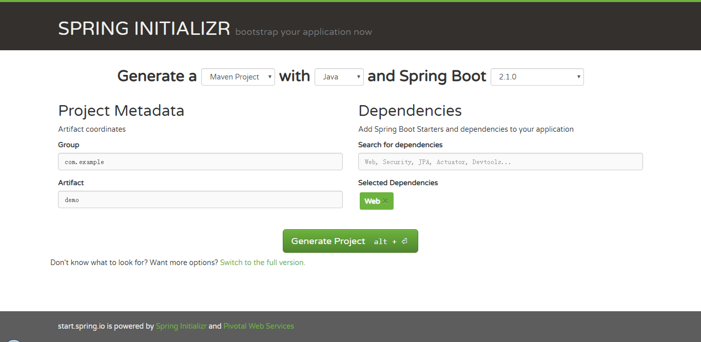 打开连接http://start.spring.io/,选择项目类型(Maven Project/Gradle Project),语言类型(Java/Kotlin/Groovy),Spring Boot的版本;再填入一些工程的基本信息。Group指的是工作小组或者公司的名字,对应着工程文件下面的包名;Artifact指的是工程的名字,人家Spring Boot把一个项目当做一项手工艺品,这种工匠精神,佩服。然后点击下方“Generate Project”按钮即可把新建的工程压缩包下载到本地。