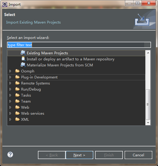 导入步骤;File - >Import -> Existing Maven Projects -> Next ->选择解压以后的文件夹 - >Finish。