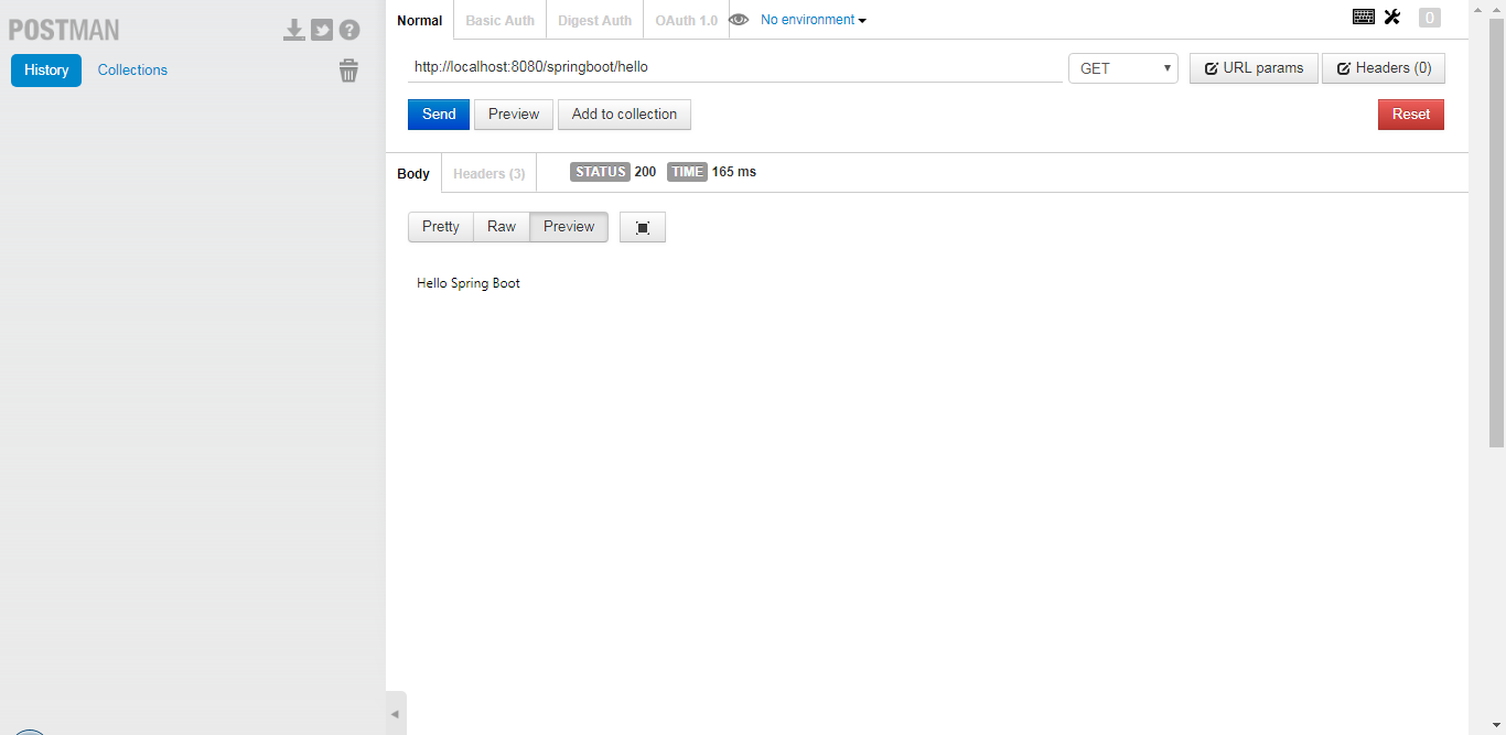 使用Postman GET方式请求http://localhost:8080/springboot/hello,可以看到返回了“Hello Spring Boot”。