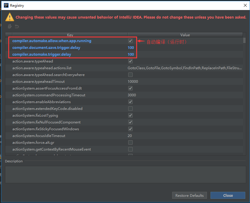 具体步骤:同时按住 Ctrl + Shift + Alt + / 然后进入Registry ,勾选自动编译并调整延时参数。