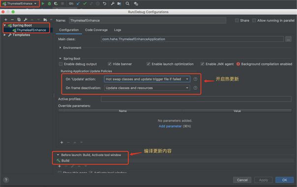 具体步骤:顶部菜单- >Edit Configurations->SpringBoot插件->目标项目->勾选热更新。