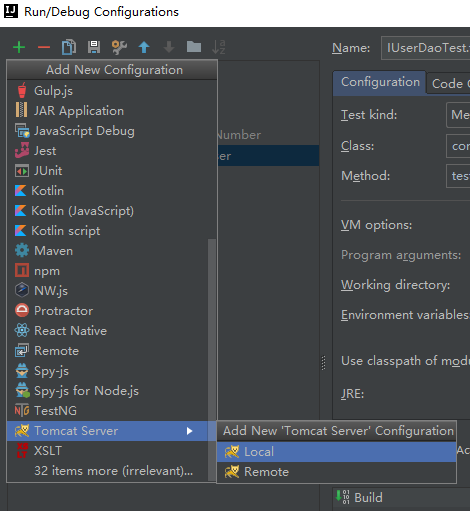 点击加号新建运行环境,选择Tomcat Server-Local