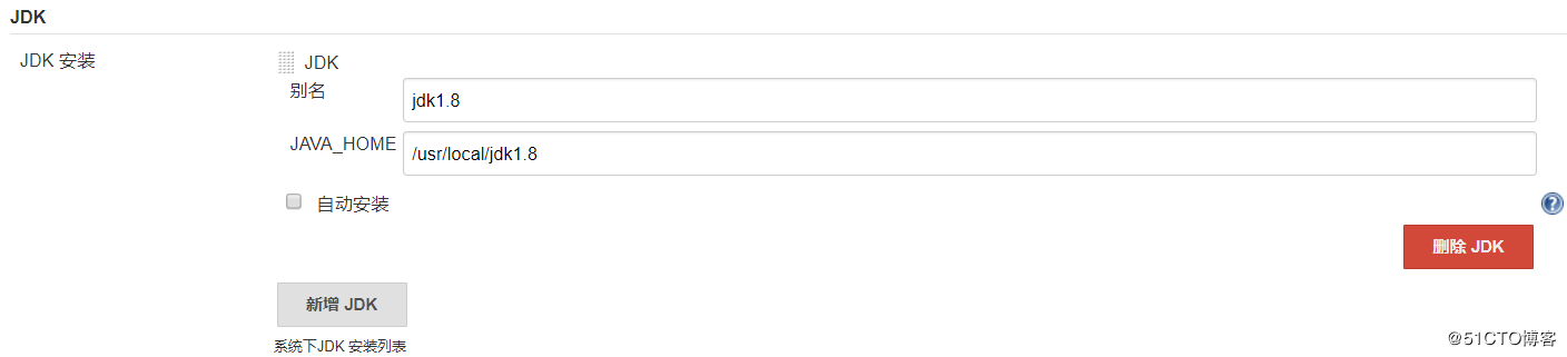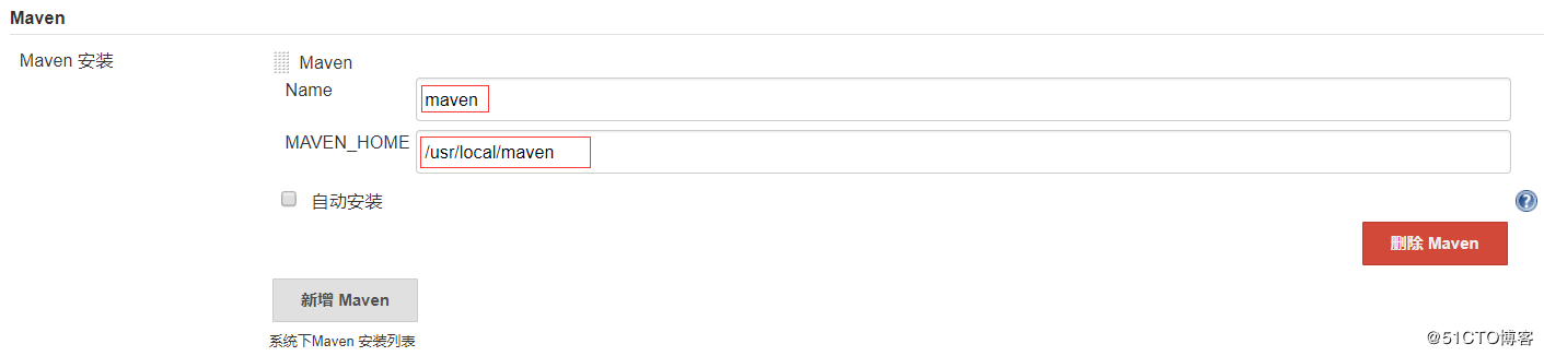 此处为手动安装的maven,需要取消自动安装maven,name可以自定义,MAVEN_HOME指定下载安装的maven具体文件目录