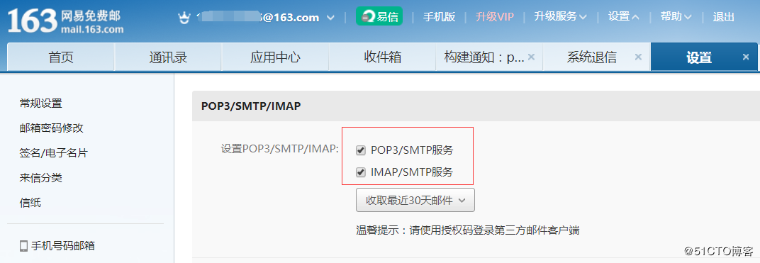 可以使用qq邮件服务器或163等其他邮件服务器,在此配置使用163邮箱,首先需要开启163邮箱的smtp服务。