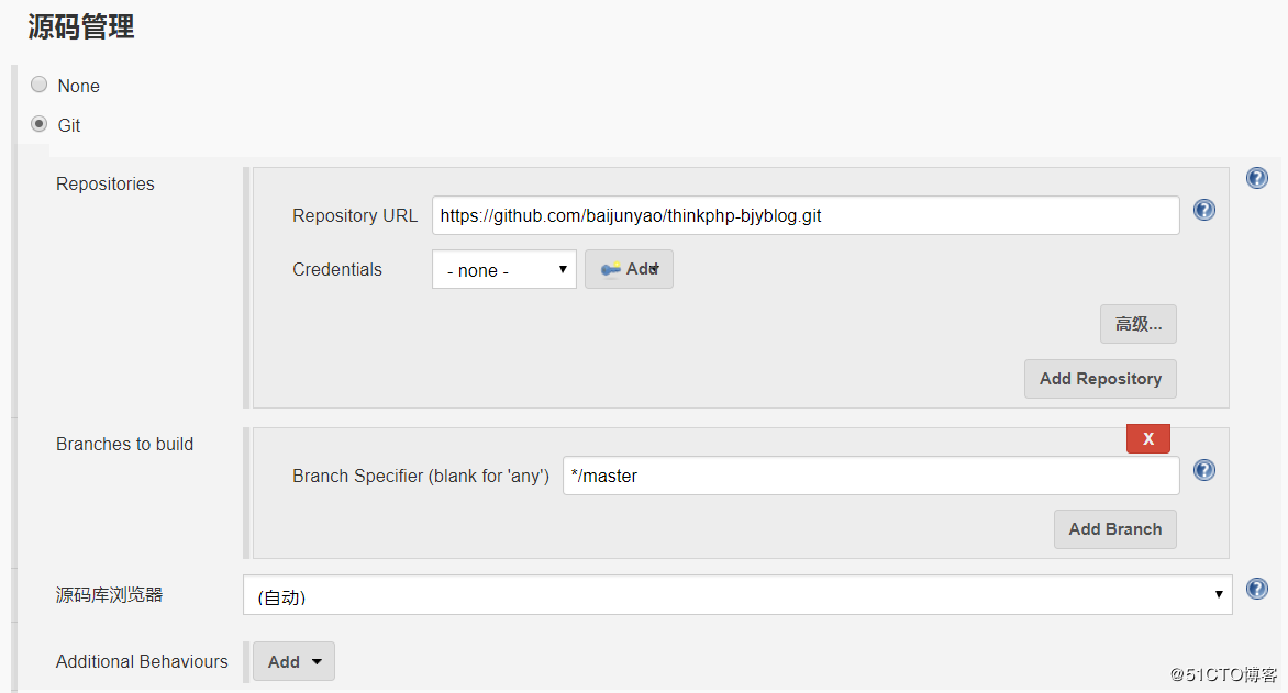 Repository URL 填写具体git上的仓库url,如果为私有,需要继续添加Credentials,如果为公有直接填写url即可,Credentials为none,