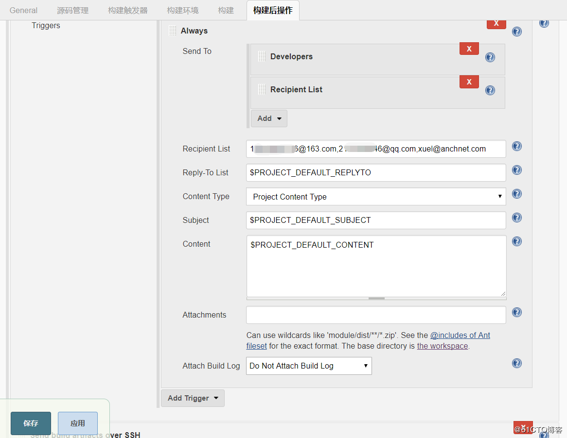 在默认的触发器 Default Triggers 标签下,可以勾选邮件通知触发的情况,如任何情况下均需要选择always,也可以在仅失败情况下发送,也可以对应的邮件接受人不通,进行邮件分类。
