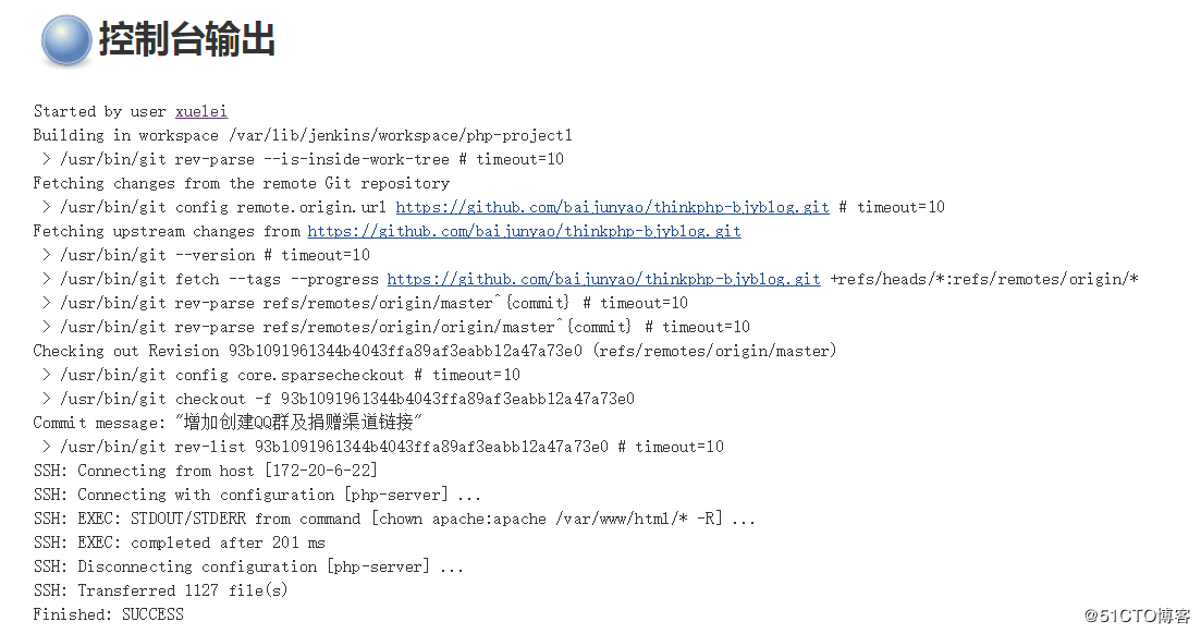 点击保存,并立即构建,可以点击console output查看日志