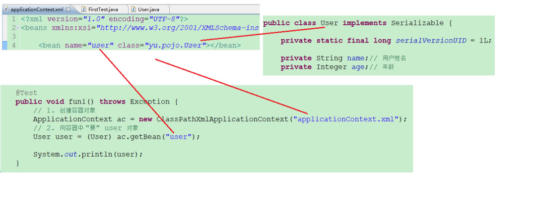 上图展示的就是最基本的演示,也是很容易就理解了,配置文件中配置了 user 对象,我们通过加载配置文件来获取对象从而避免了使用 new 来创建。