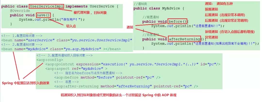 上面的整个过程就是 Spring 中 AOP 的体现,将通知织入到目标对象中形成代理的这么一个过程。我们为了这个需要准备目标对象,通知对象,还要学会如何配置切点和切面。