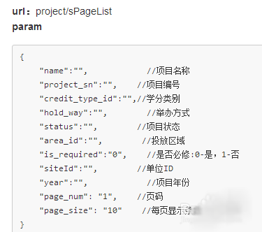 "name":"", //项目名称 "project_sn":"", //项目编号 "credit_type_id":"",//学分类别 "hold_way":"", //举办方式 "status":"", //项目状态 "area_id":"", //投放区域 "is_required":"0", //是否必修:0-是,1-否 "siteId":"", //单位ID "year":"", //项目年份 "page_num": "1", //页码 "page_size": "10" //每页显示条数
