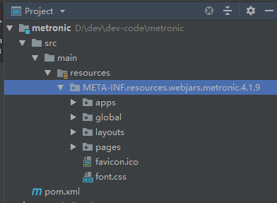 1、新建SpringBoot工程 然后在src\main\resources\ 新建目录 META-INF\resources\webjars\metronic 重点来了 这里4.1.9 必须跟POM文件的<version>4.1.9</version>保持一致。