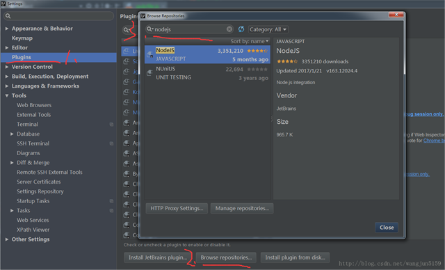 File—–settings—-plugins—-browse repository—–输入nodejs,点击安装就可以了