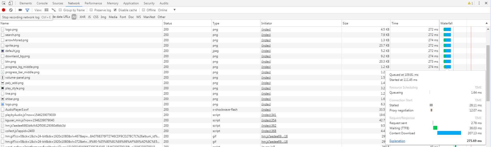 但是使用java访问的时候爬取的html里却没有该mp3的文件地址,那么这肯定是在该页面的位置使用了js来加载mp3,那么刷新下网页,看网页加载了哪些东西,加载的东西有点多,着重看一下js、php的请求,主要是看里面有没有mp3的地址,分析细节就不用说了,
