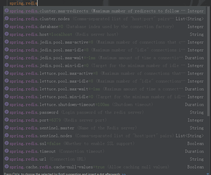 我们先看一下都有哪些Redis相关配置,发现好多都有默认值,而且刚好符合我们现在的测试环境,于是乎我的配置文件是这样滴....
