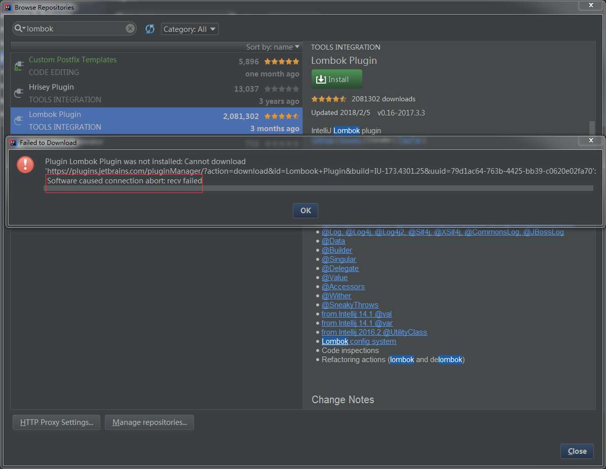 由于无法通过插件仓库下载安装,于是想着通过本地下载并install的方式来把Lombok安装到IDEA编辑器中,过程中也遇到了一些小问题,比如不知道在哪里下载安装包,比如版本号冲突无法安装等等,但是都一一解决。