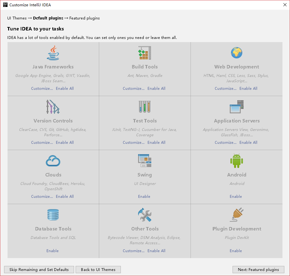 然后到达定制插件页面,在这我会选择先把所有的插件关闭掉,然后再根据自己的需要打开,一方面可以提升流畅度,另一方面也可以减少用不到的东西的干扰。你可以在此根据自己用到的技术选择开启的插件。强烈建议打开插件Database Tools and SQL。