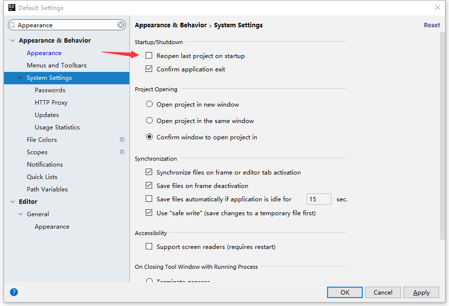 取消勾选启动时打开上次的项目,如果这个被选上时,切换项目将会变得非常麻烦,所以我们把他取消掉
