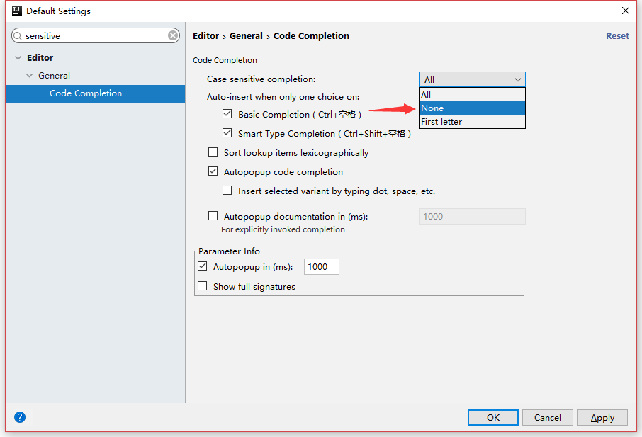 取消代码补全的大小写敏感,在这改为None,不再需要刻意注意大小写
