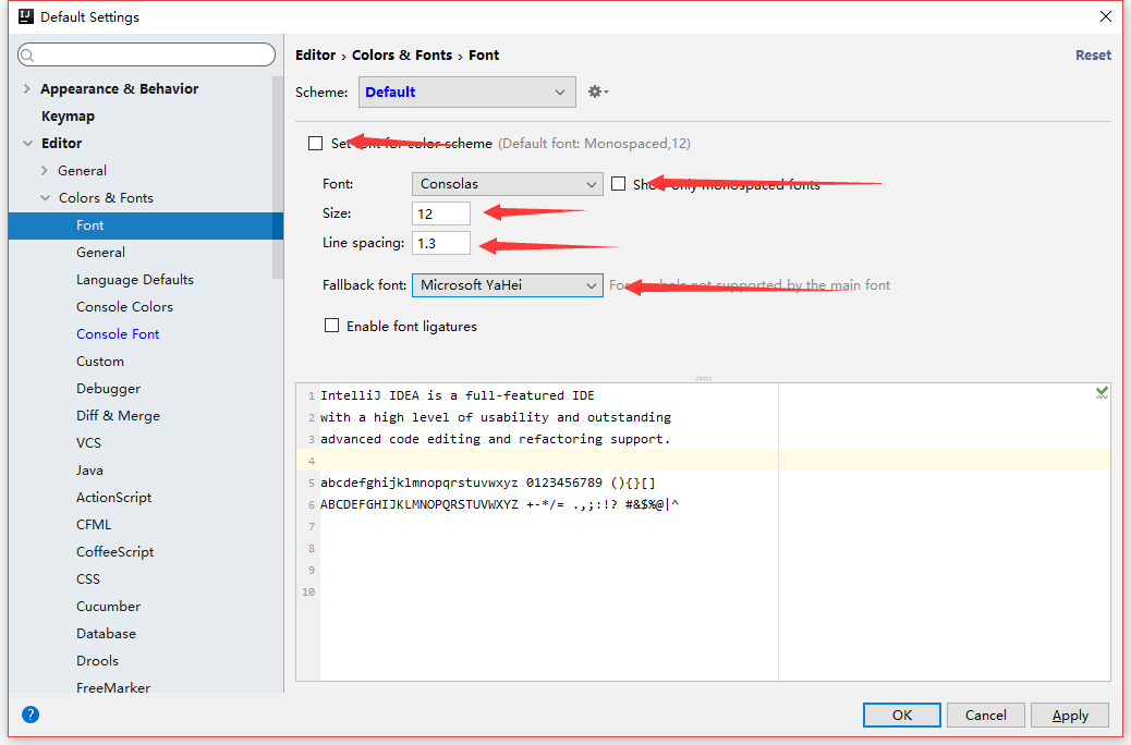 修改编辑器字体,并将中文字体改为微软雅黑,默认字体在Windows中的显示非常的糟糕,必改。Consolas字体和1.3的行距是我多次尝试后得出的最佳配置。