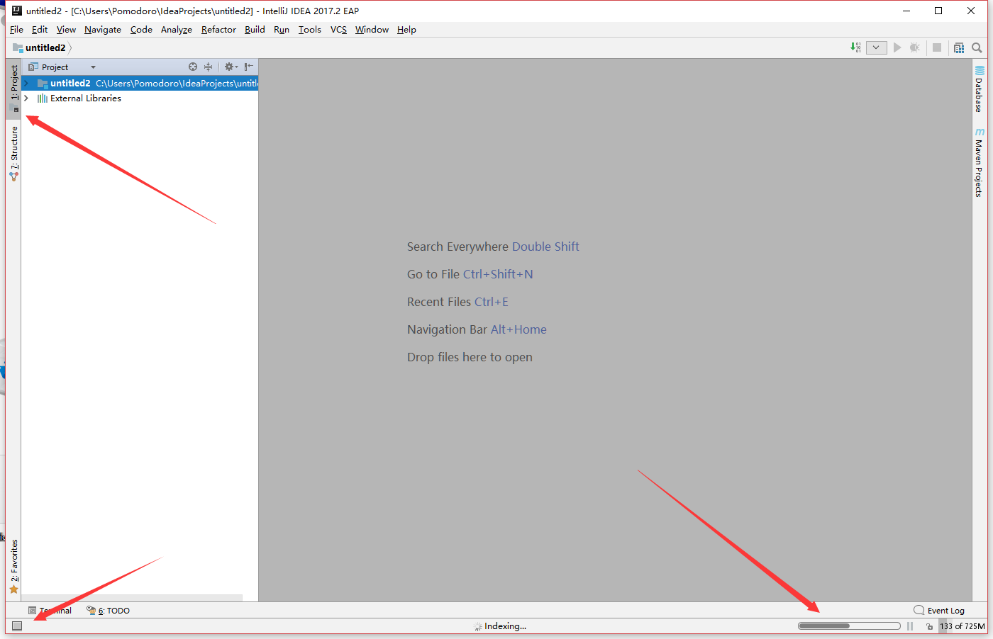 在项目内,点击左下角的正方形调出侧边菜单,然后点击左上的Project菜单打开项目文件夹,第一次打开项目时会建立索引,右下角可以看到索引进度,这时候系统CPU占用会很高,先等待索引完成再进行操作