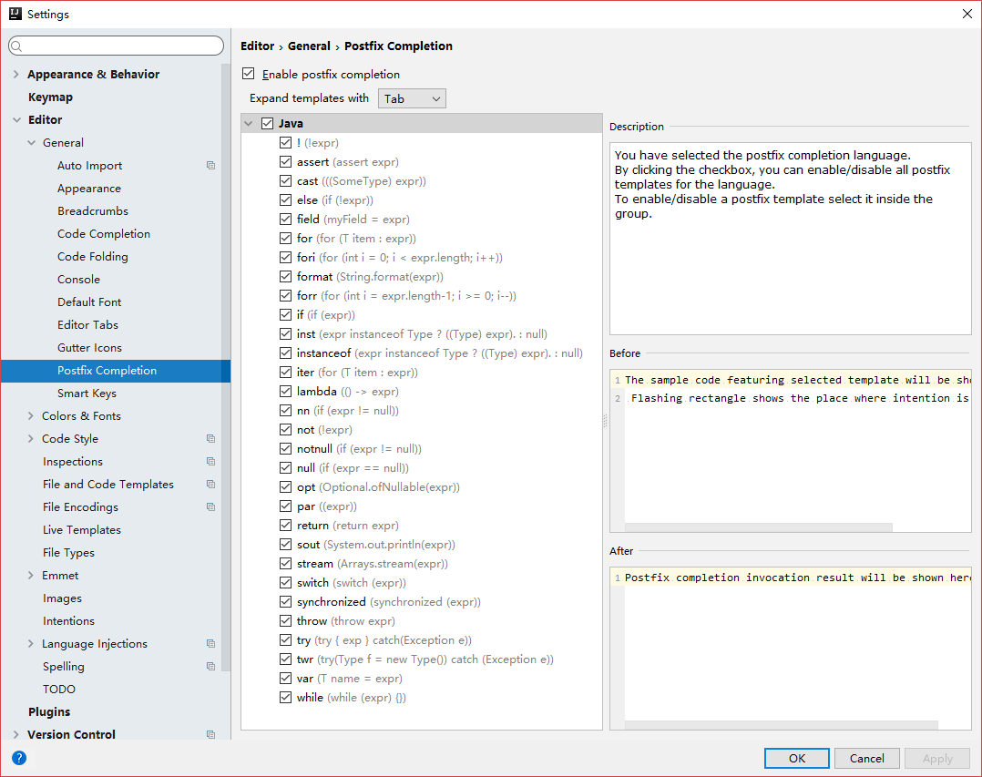 后缀补全,在变量后面输入.sout即可用System.out.println()将其包含起来,输入5.fori将提示转换成for (int i = 0; i < 5; i++) {},输入psmv将可以转换成main函数,还有其他的可以参考Setting内的下图位置。