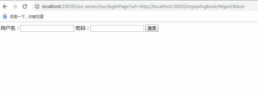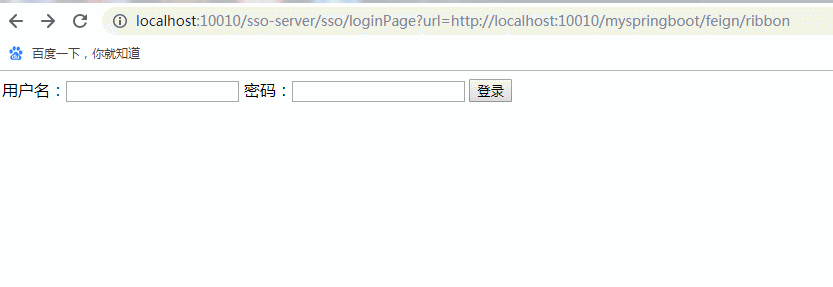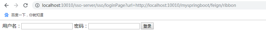 刚开始,没有cookie且无Redis的情况下,浏览器访问http://localhost:10010/myspringboot/feign/ribbon,被zuul-server拦截重定向到sso-server登录页面