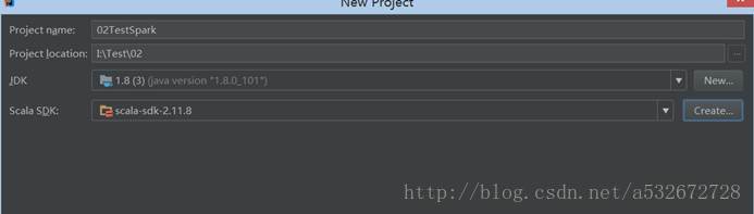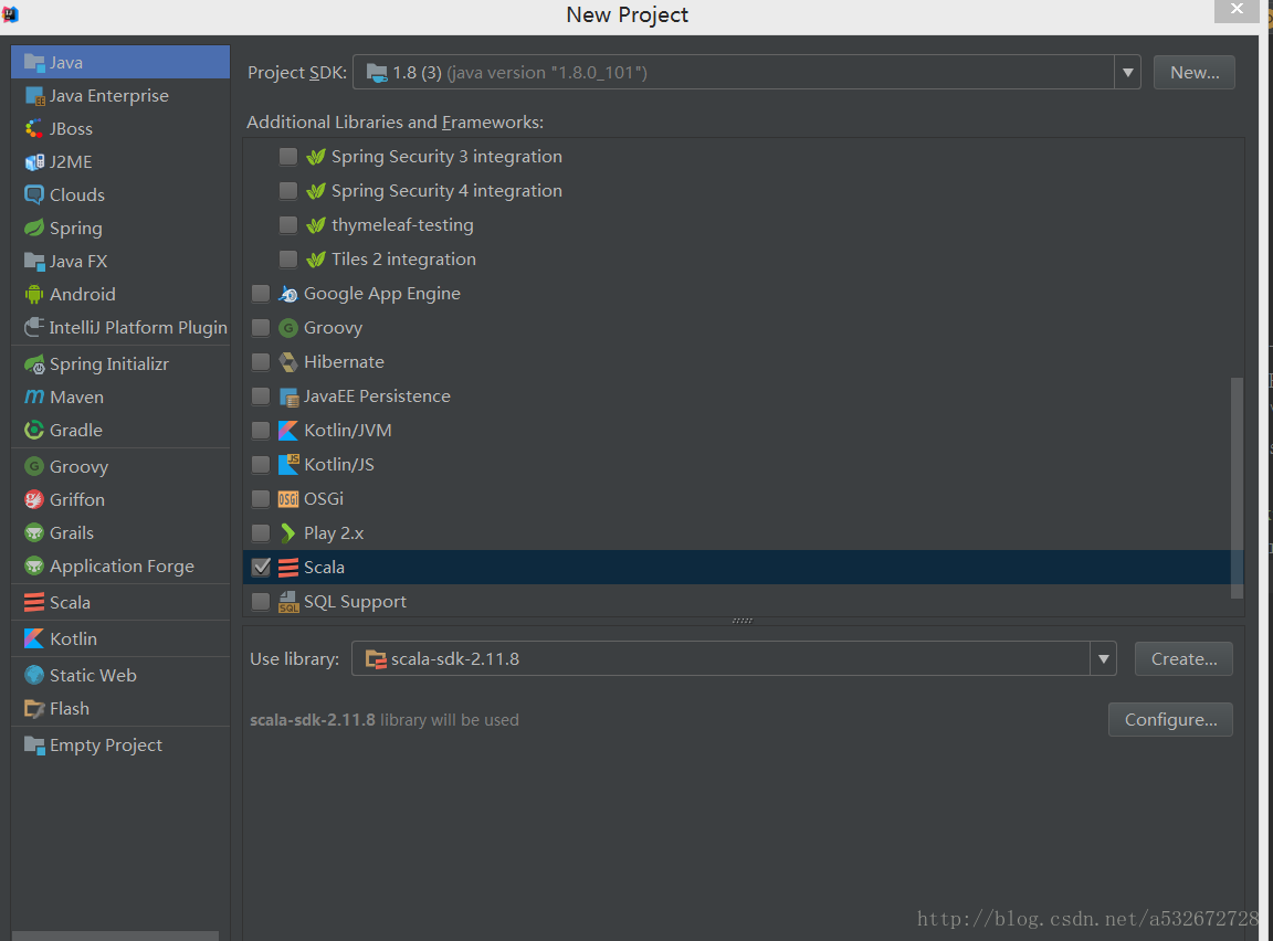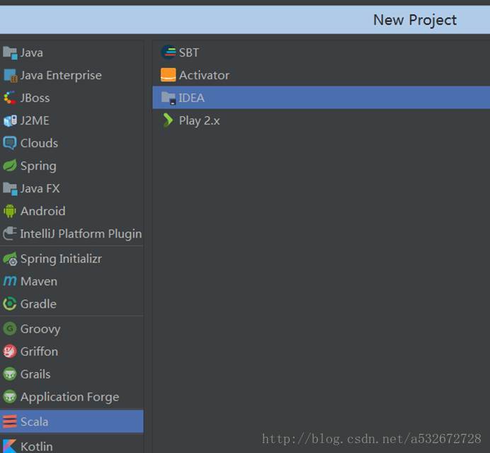1、选择File->new Project->Java->Scala,这里scala版本是2.11.8