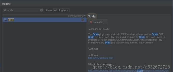 11 .成功输出,表明Intellij创建spark项目成功,当然前提是intellij安装了scala插件,在File->Settings->Plugins,搜索scala,根据查找的结果进行安装后重启intellij即可,下图是我已经安装好的