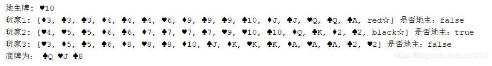 System.out.println("玩家" + (j + 1) + ": " + players.get(j).getNewPokers() + " 是否地主:" + players.get(j).isLandower());