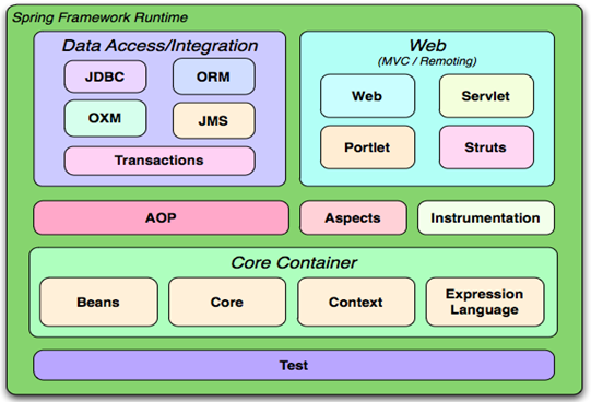 Core Container、Data Access/intergration、Web、AOP(Aspect Oriented Programming)、Instrumentation和测试部分,如下图所示: