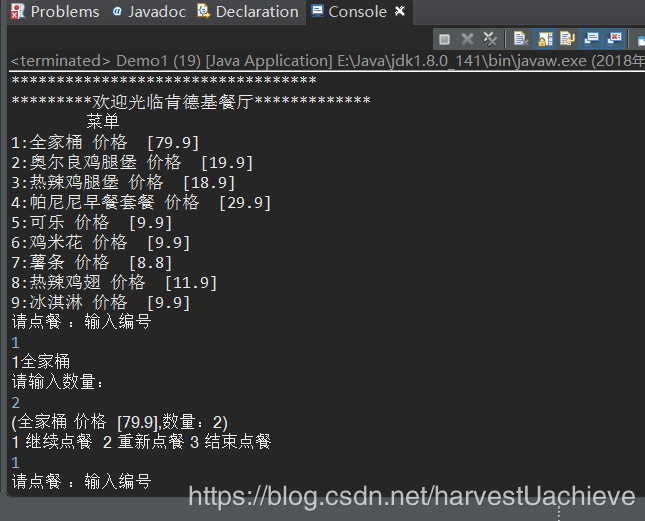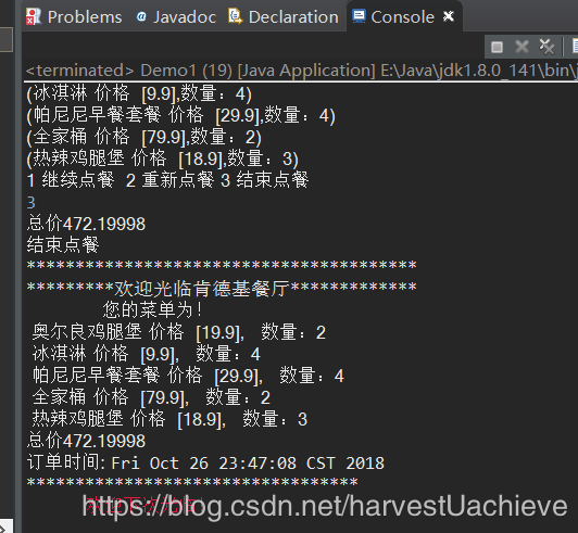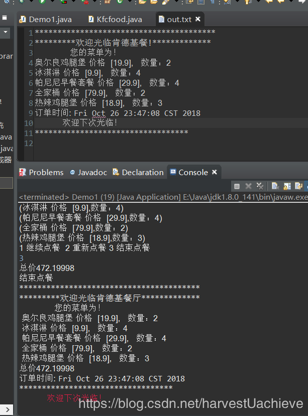 * Demo1 是主程序 核心 是HashMap 集合,HashMap<Kfcfood , String > 做购物车 添加食物 和遍历打印小票