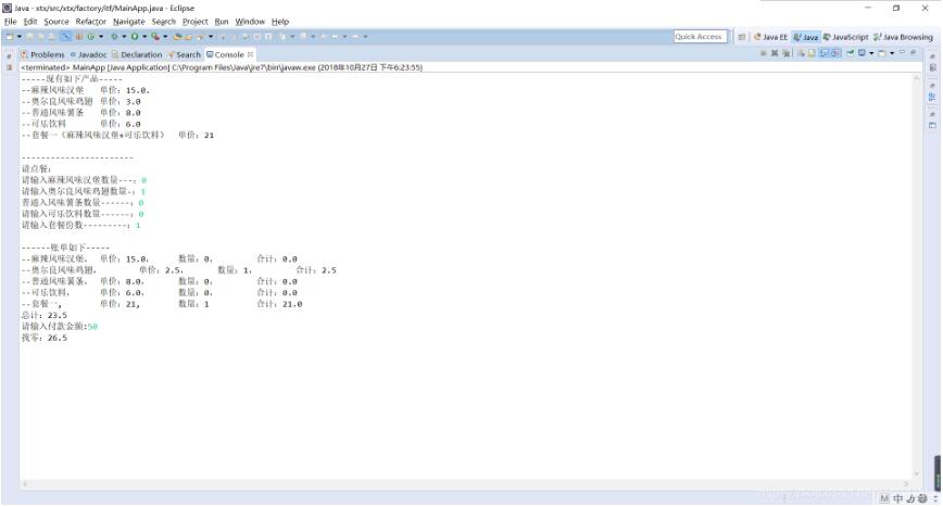 System.out.print("--套餐一,\t单价:21,\t数量:"+num+"\t\t合计:"+(beverage.totalPrice()+hamburg.totalPrice())+"\n");