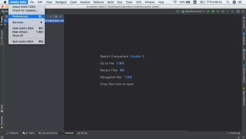 设置IDEA编辑器自动编译功能,进入IDEA的配置项中,选择顶部菜单的 IntelliJ IDEA -> Perferences... 会弹出一个设置对话框