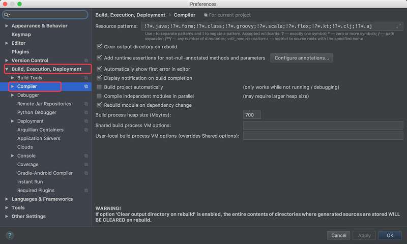 在弹出的对话框中点击Build, Execution, Deployment选项下的Compiler选项