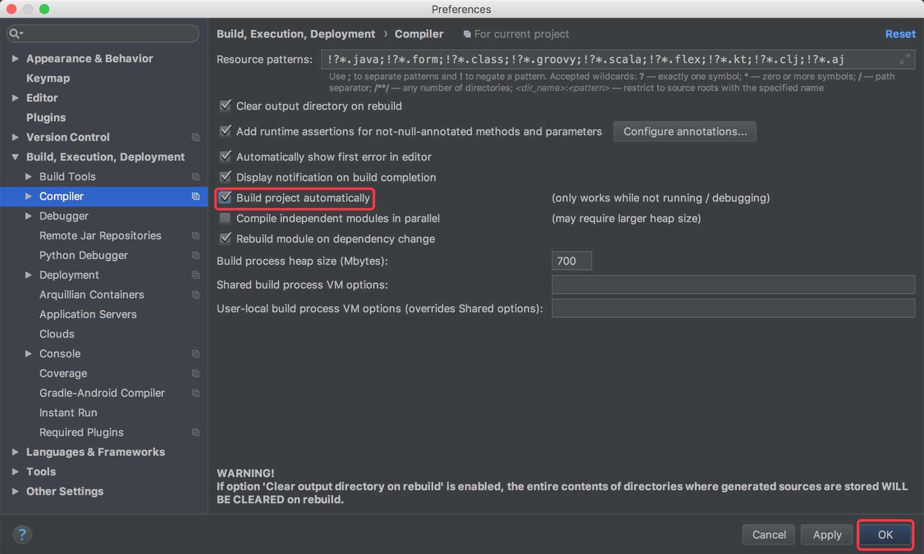 勾选Compiler选项中的Build project automatically选项开启IDEA自动编译项目,然后点击OK即可