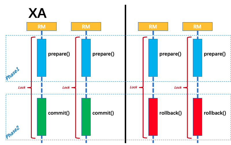 传统的2PC提交协议,会持有一个全局性的锁,所有局部事务预提交成功后一起提交,或有一个局部事务预提交失败后一起回滚,最后释放全局锁。锁持有的时间较长,会对并发造成较大的影响,死锁的风险也较高。