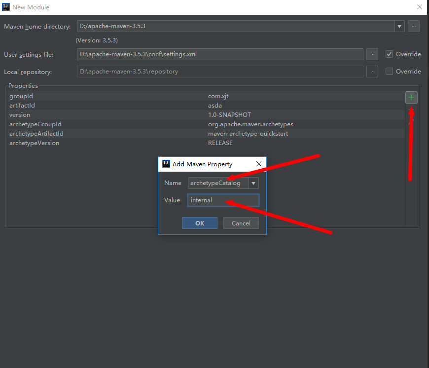 设置好参数后,新建maven项目的时候添加上参数archetypeCatalog,值为local,或者是如果本地仓库里有了catalog文件,参数值也可以为local