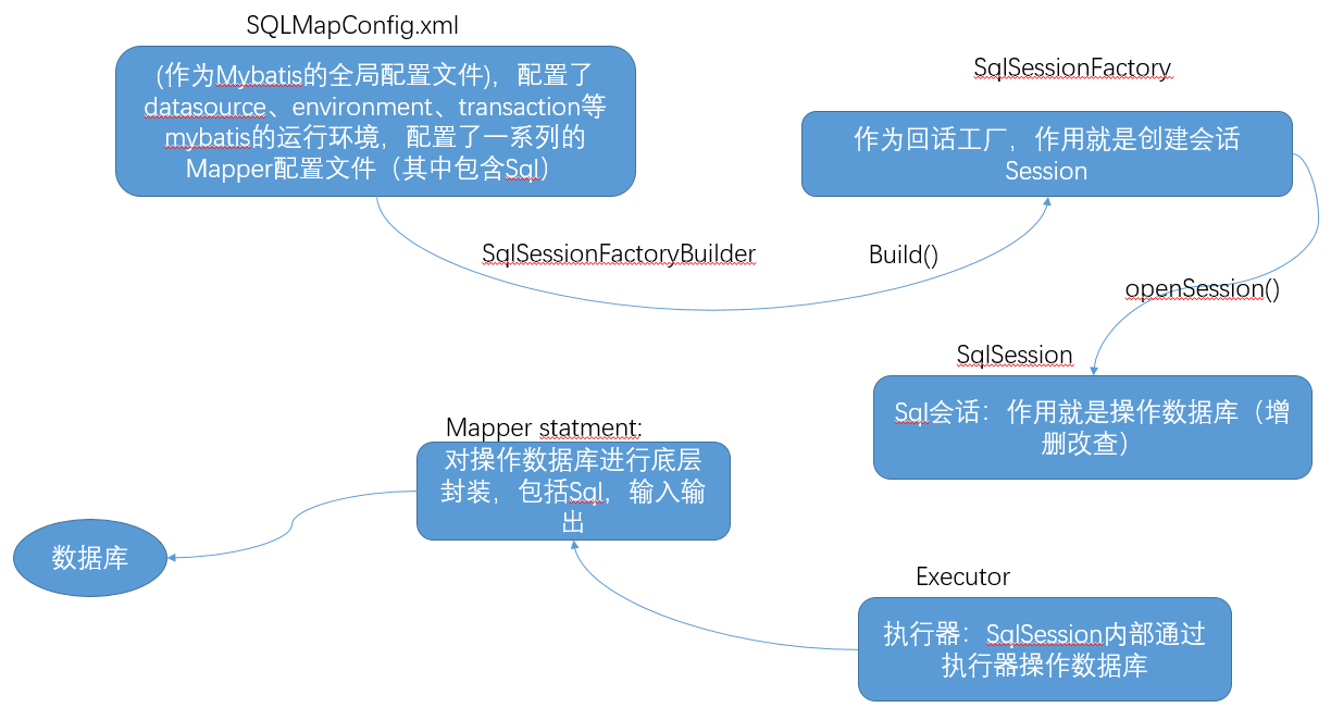 1、加载mybatis全局配置文件(数据源、mapper映射文件等),解析配置文件,MyBatis基于XML配置文件生成Configuration,和一个个MappedStatement(包括了参数映射配置、动态SQL语句、结果映射配置),其对应着<select | update | delete | insert>标签项。
