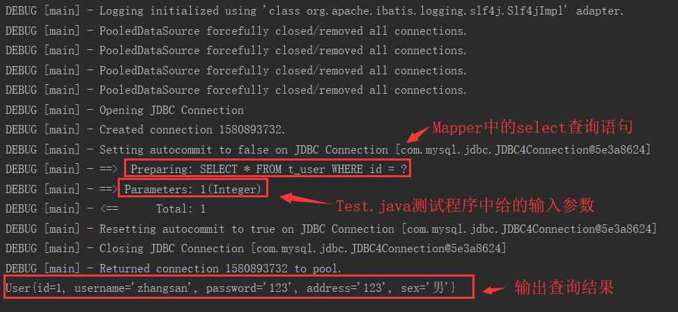 <?xml version="1.0" encoding="UTF-8" ?> <!DOCTYPE configuration PUBLIC "-//mybatis.org//DTD Config 3.0//EN" "http://mybatis.org/dtd/mybatis-3-config.dtd"> <configuration> <!--加载资源文件--> <!-- <properties resource="jdbc.properties"></properties> <!–settings配置LOG4J输出日志 –> <settings> <setting name="logImpl" value="LOG4J"/> </settings>--> <!--typeAliases配置包的别名--> <!--environments配置了数据库连接,配置了driver、url、username、password属性--> <environments default="development"> <environment id="development"> <transactionManager type="JDBC"> <!--<property name="" value="" />--> </transactionManager> <dataSource type="POOLED"> <property name="driver" value="com.mysql.jdbc.Driver" /> <property name="url" value="jdbc:mysql:///mybatis01" /> <property name="username" value="root" /> <property name="password" value="123" /> </dataSource> </environment> </environments> <!--配置一个SQL语句和映射的配置文件--> <mappers> <mapper resource="UserMapper.xml" /> </mappers> </configuration> Mybatis核心配置文件