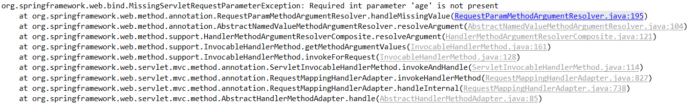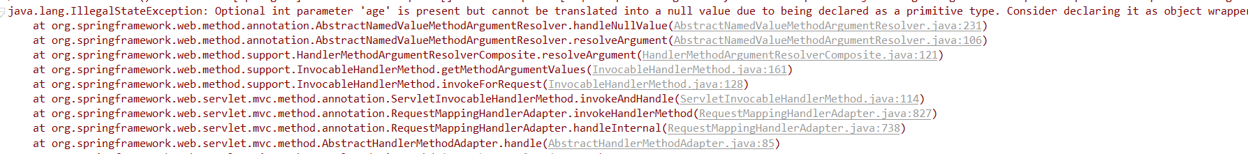 两种逻辑都没有执行就代表required为 false 且 默认值为 null ,这时候就会抛出另外一种异常,java.lang.IllegalStateException: Optional int parameter 'age' is present but cannot be translated into a null value due to being declared as a primitive type. Consider declaring it as object wrapper for the corresponding primitive type