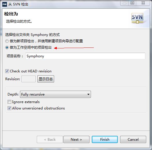 然后选择作为工作空间中的项目检出(注意不要选错)。点击finish。