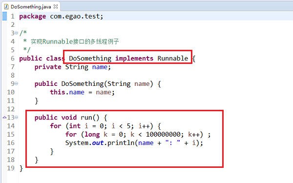 第二步我们首先看一下DoSomething类,实现了Runnable接口,成为线程类,并在run方法中进行双层循环打印姓名和数字,如下图所示: