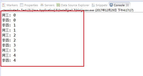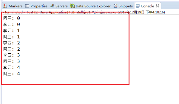 第四步我们运行Test测试类,可以看到控制台打印出了结果,需要注意的是启动线程只需要调用start方法就可以,java虚拟机会执行Runnable接口中的run()方法,如下图所示: